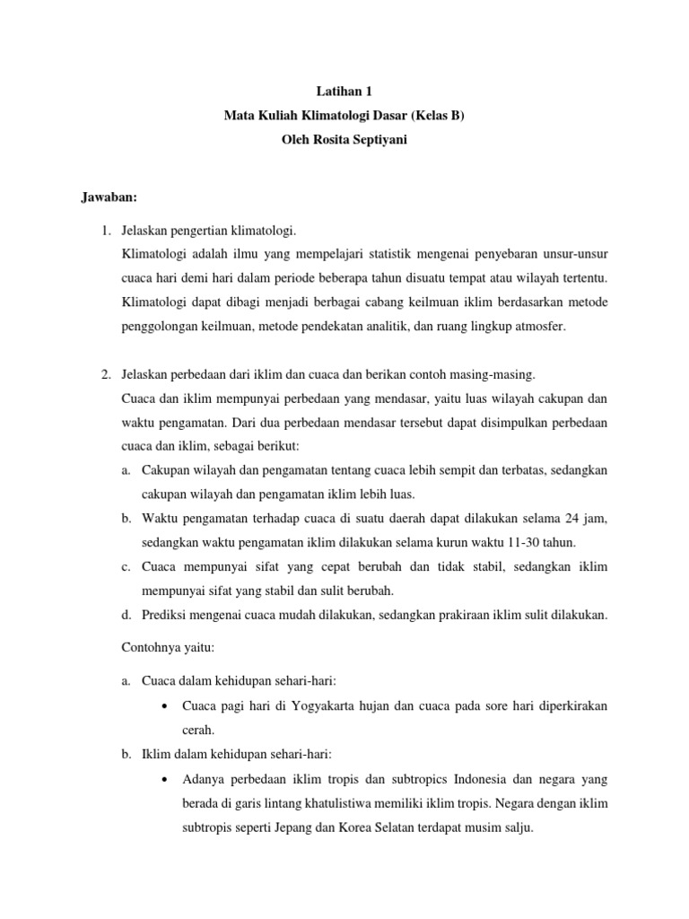 Ilmu Yang Mempelajari Cuaca Dan Iklim - Cara Mengajarku from imgv2-2-f.scribdassets.com Cuaca biasanya terjadi pada waktu yang relatif singkat dengan wilayah yang relatif sempit. Indonesia merupakan salah satu negara yang beriklim tropis, maka sangat cocok sekali untuk usaha. Cuaca menyatakan kondisi atmosfer sesaat, mulai menit, jam hingga hari pada suatu tempat tertentu. Berikut ini akan dijelaskan mengenai perbedaan cuaca dan iklim beserta penjelasan dan contohnya. Seperti cuaca cerah, banyak cahaya matahari, kecepatan angin, udara sejuk, kering, panas, dan sebagainya sangat mempengarui terhadap pelaksanaan wisata, baik wisata darat maupun laut. Sebutkan 7 perbedaan cuaca dan iklim. Sebutkan 7 perbedaan cuaca dan iklim. Adapun iklim merupakan keadaan atmosfer dalam periode yang panjang dan dalam wilayah yang luas.